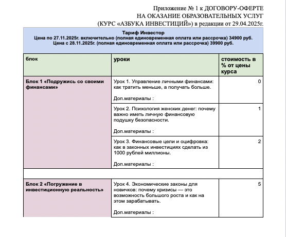 2.1. Предметом настоящего Договора является возмездное предоставление Заказчику образовательных услуг в виде онлайн Курса «Азбука инвестиций» (далее по тексту – «Услуги» или «Услуга»).